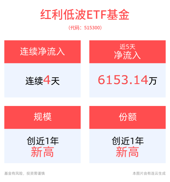 规模方面,红利低波ETF基金最新规模达50.80亿元,创近1年新高。份额方面,红利低波ETF基金最新份额达38.00亿份,创近1年新高。从资金净流入方面来看,红利低波ETF基金近4天获得连续资金净流入,最高单日获得2005.16万元净流入,合计“吸金”6548.68万元。
